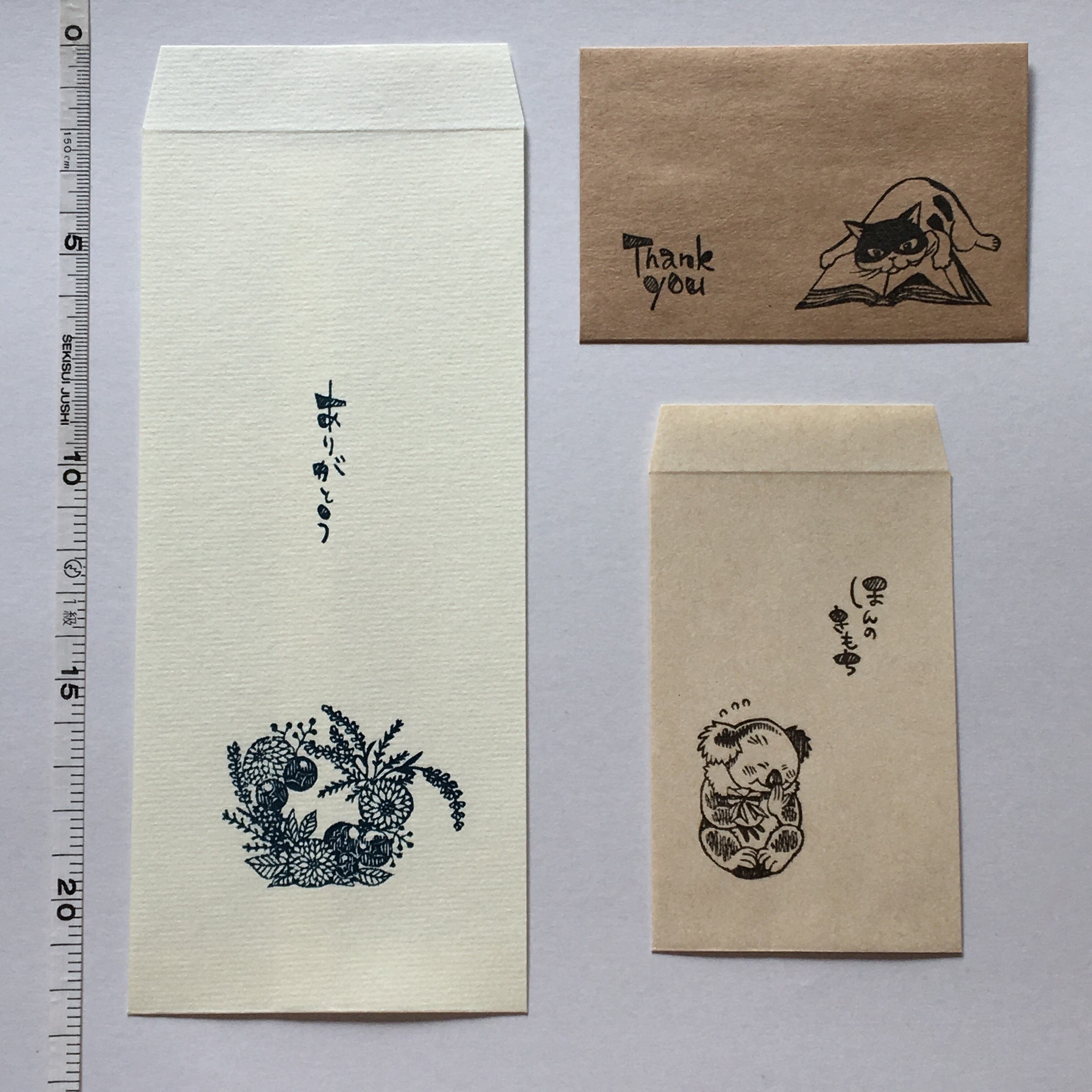 消しゴムはんこを手捺しした封筒の6枚セットです。