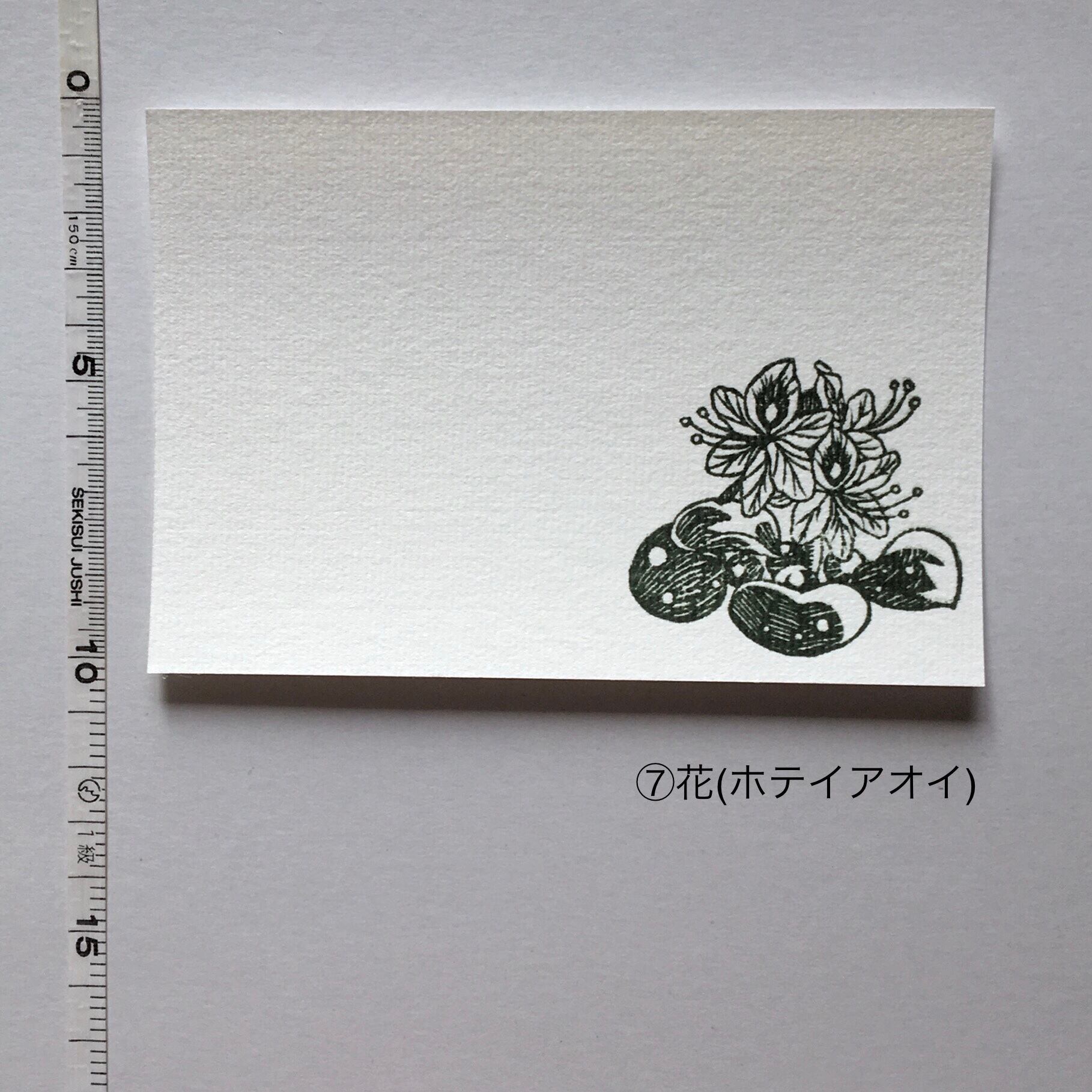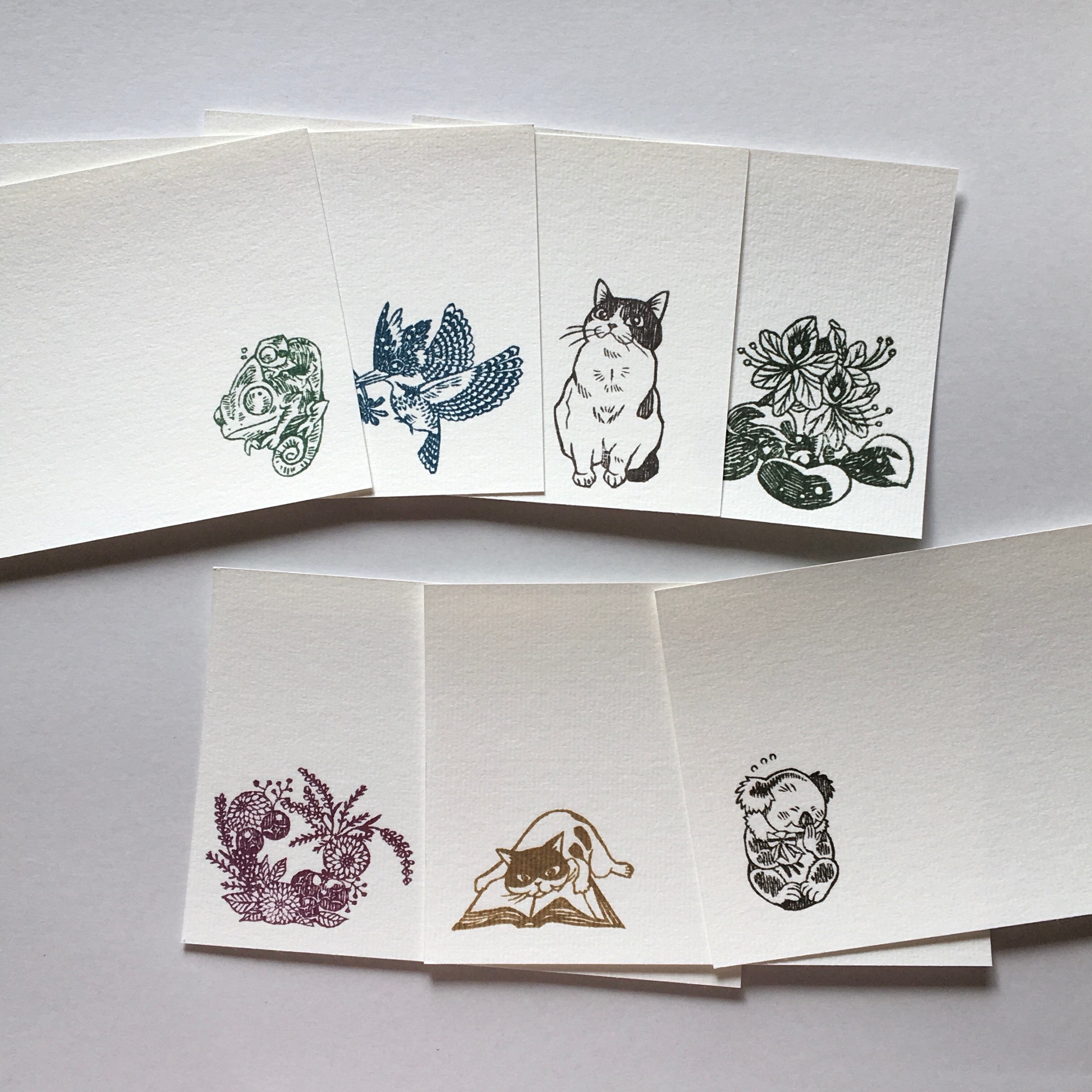 消しゴムはんこを手捺しした画仙紙はがきの7枚セットです。
