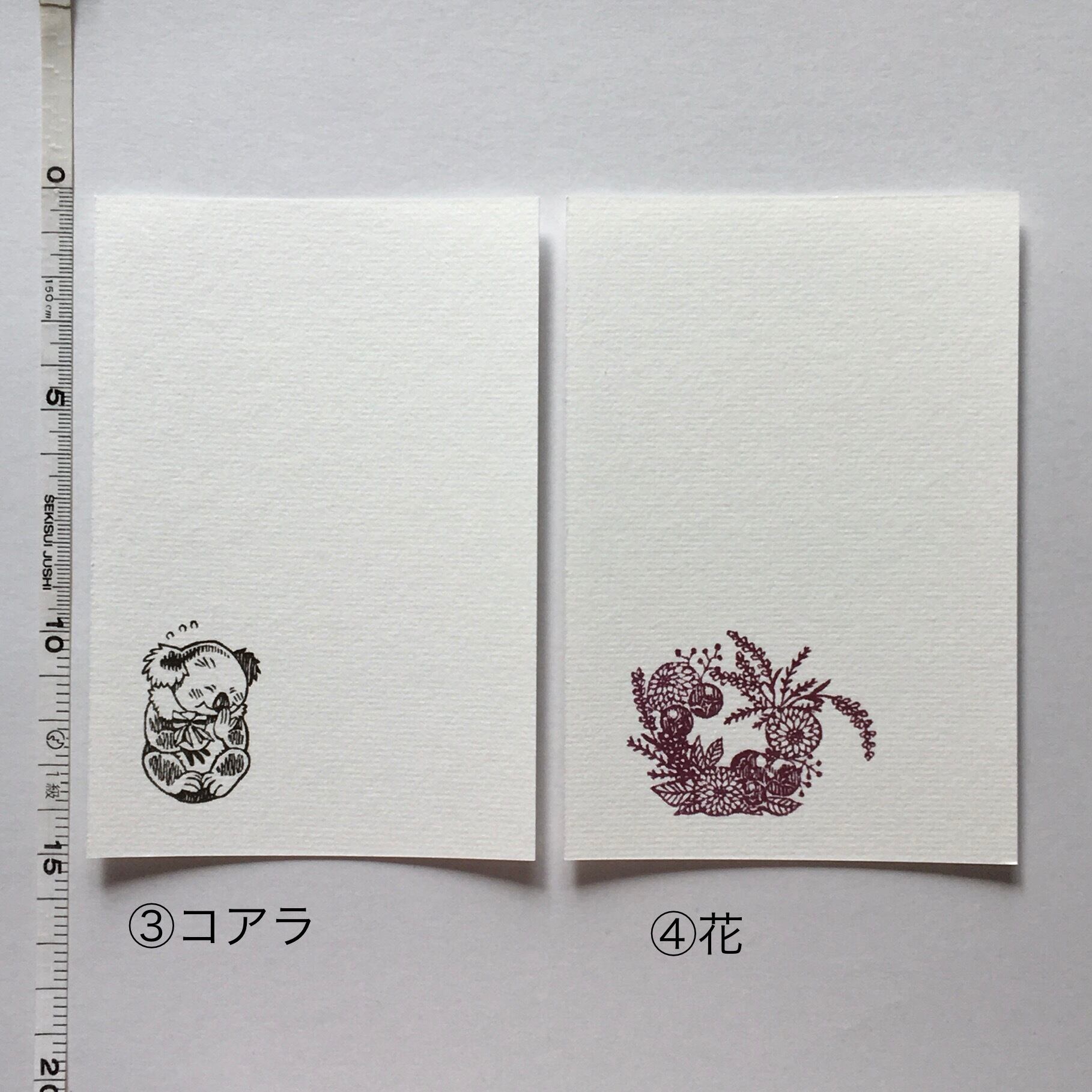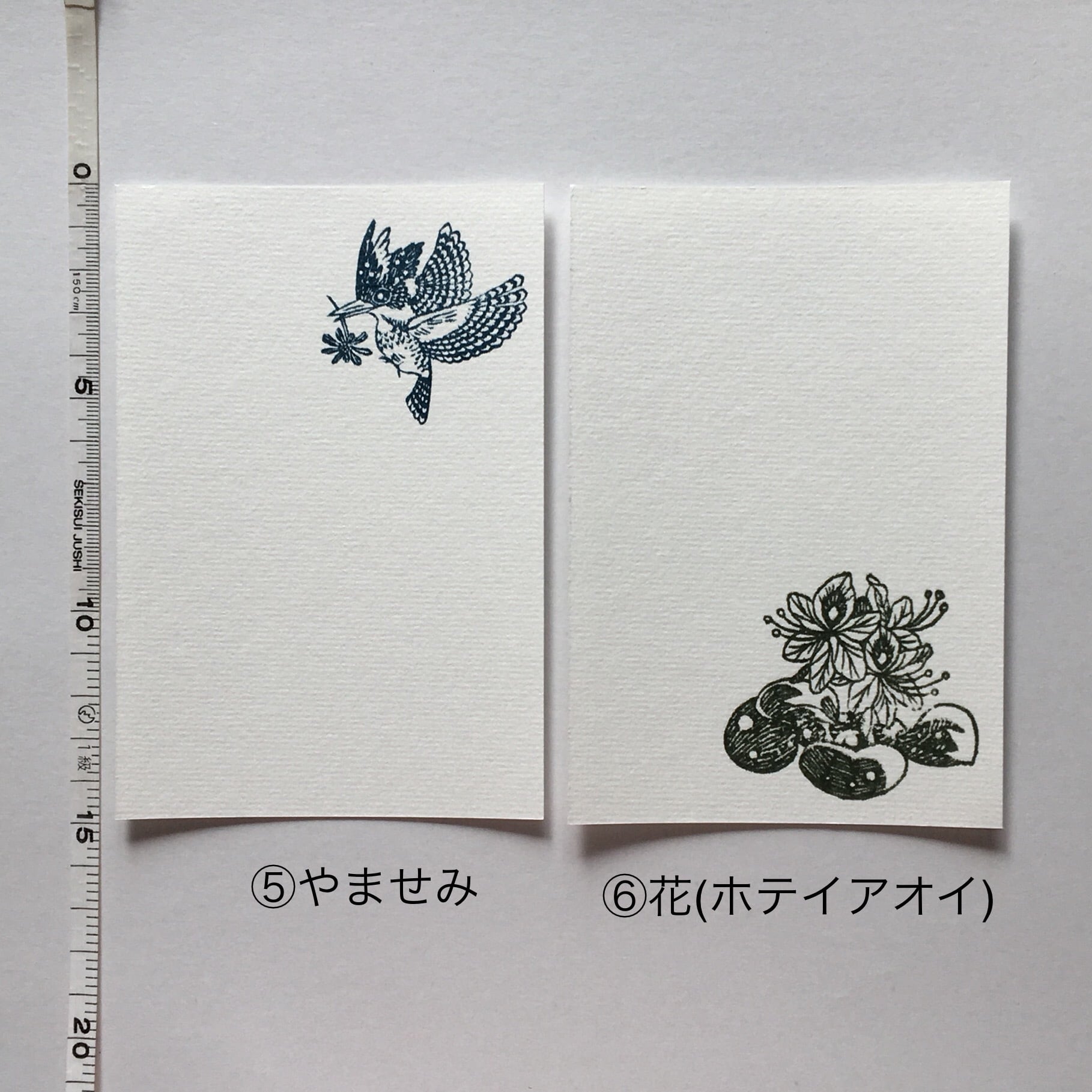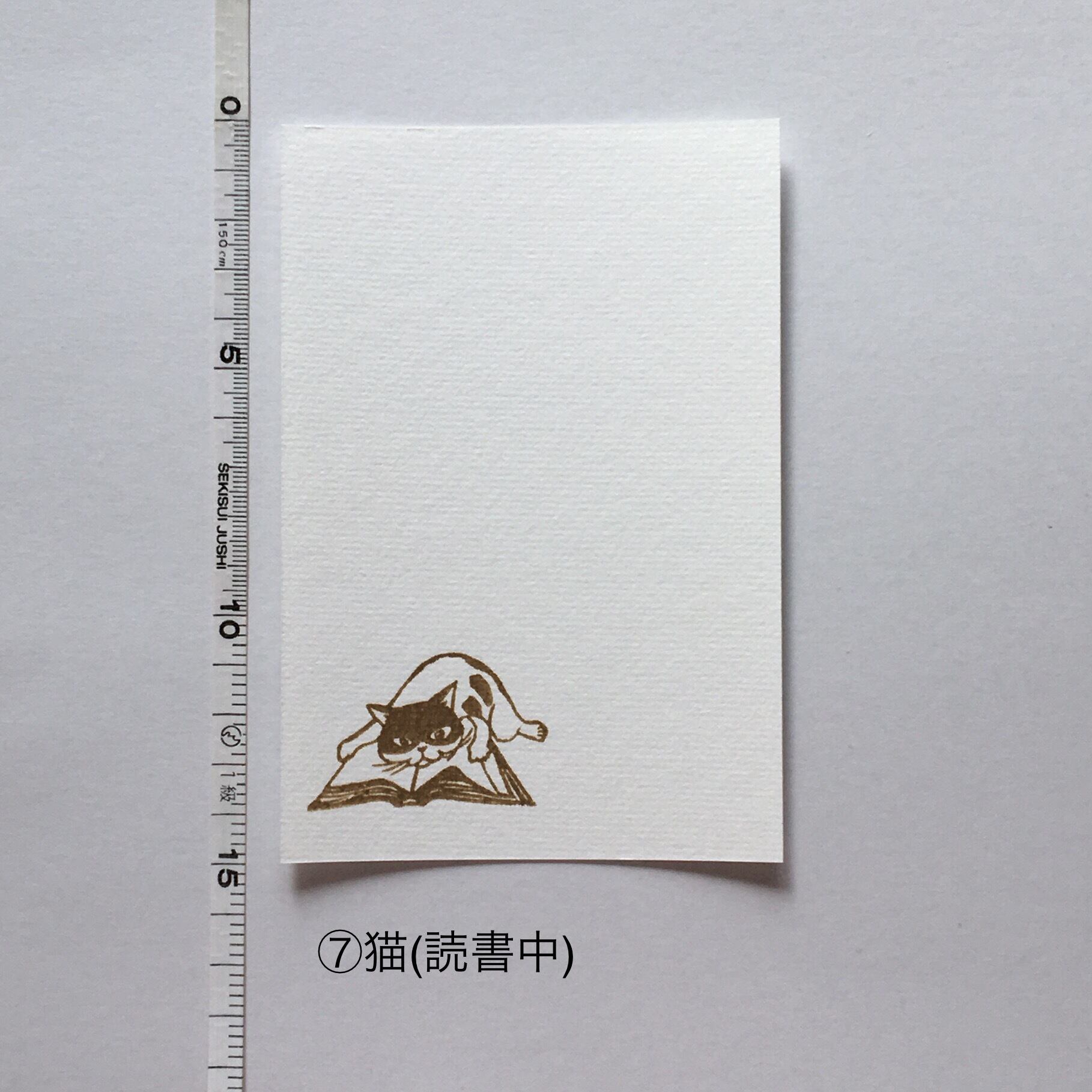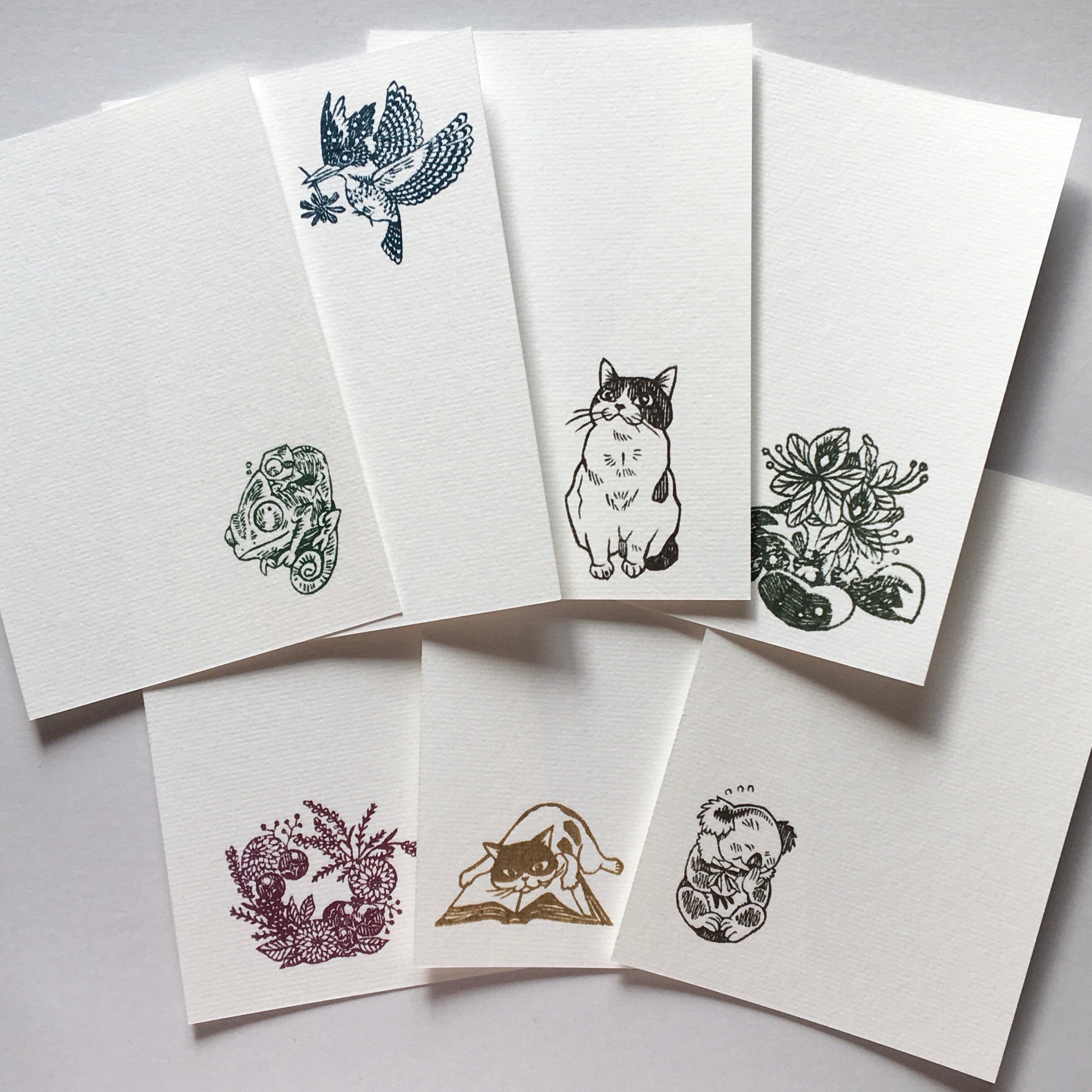 消しゴムはんこを手捺しした画仙紙はがき7枚セットです。