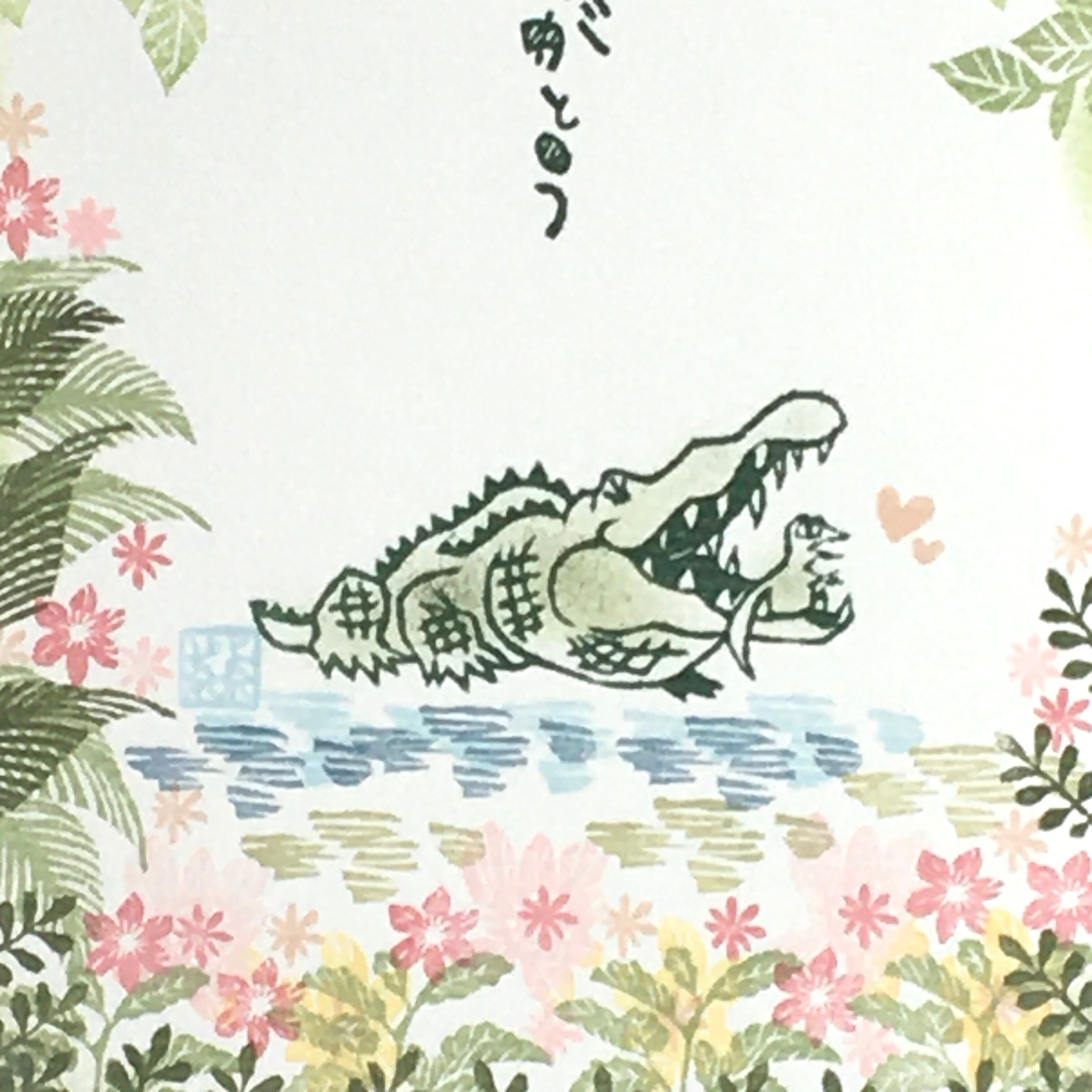 味わいのある画仙紙のポストカードに、ジャングルをお散歩するワニの親子を描きました。