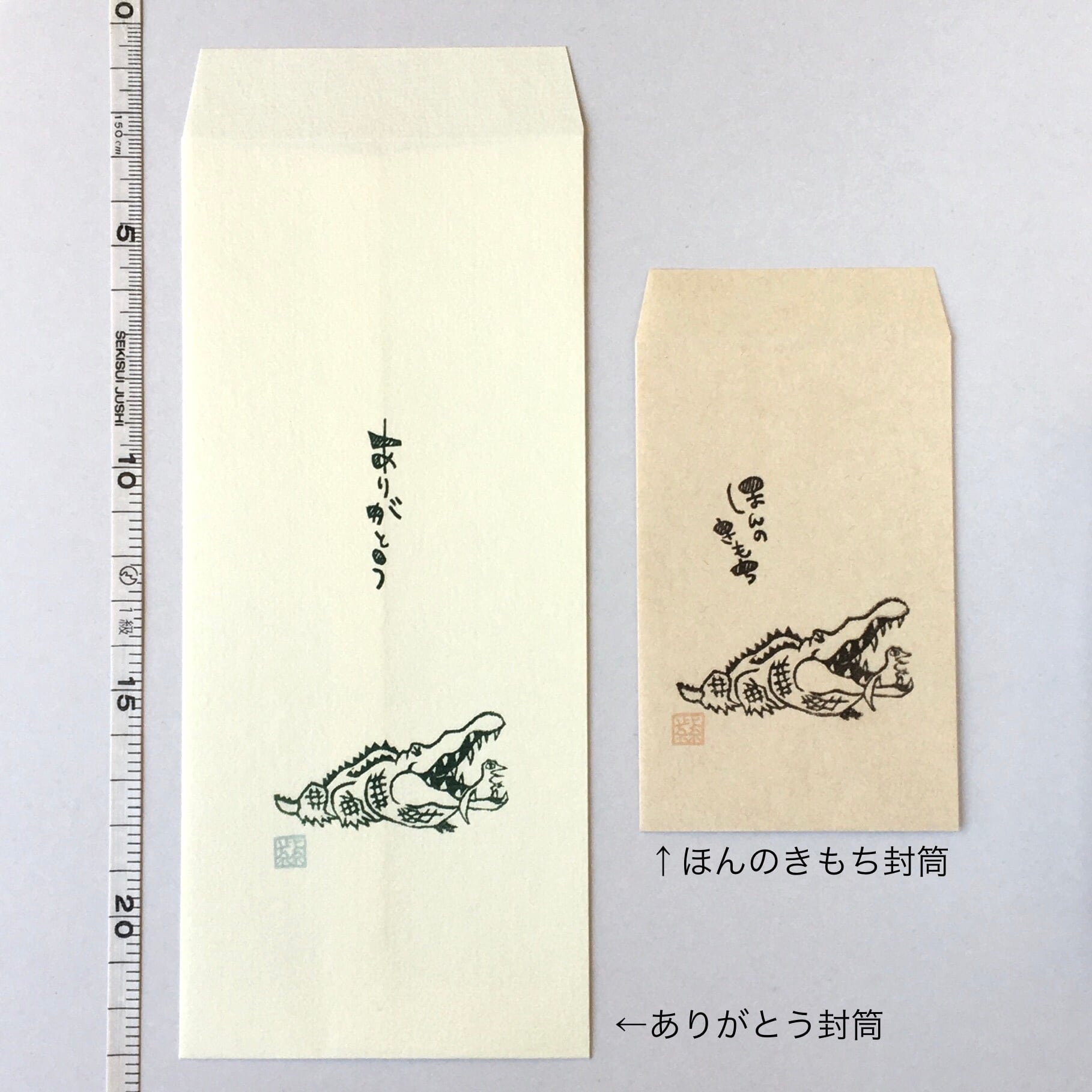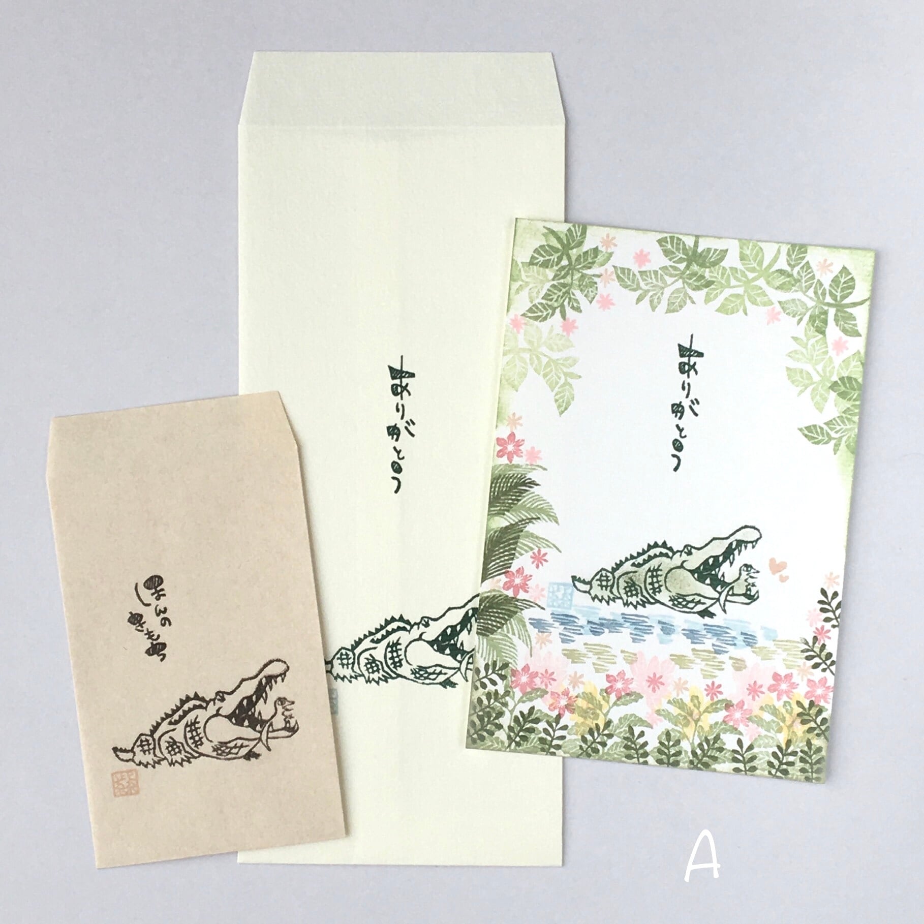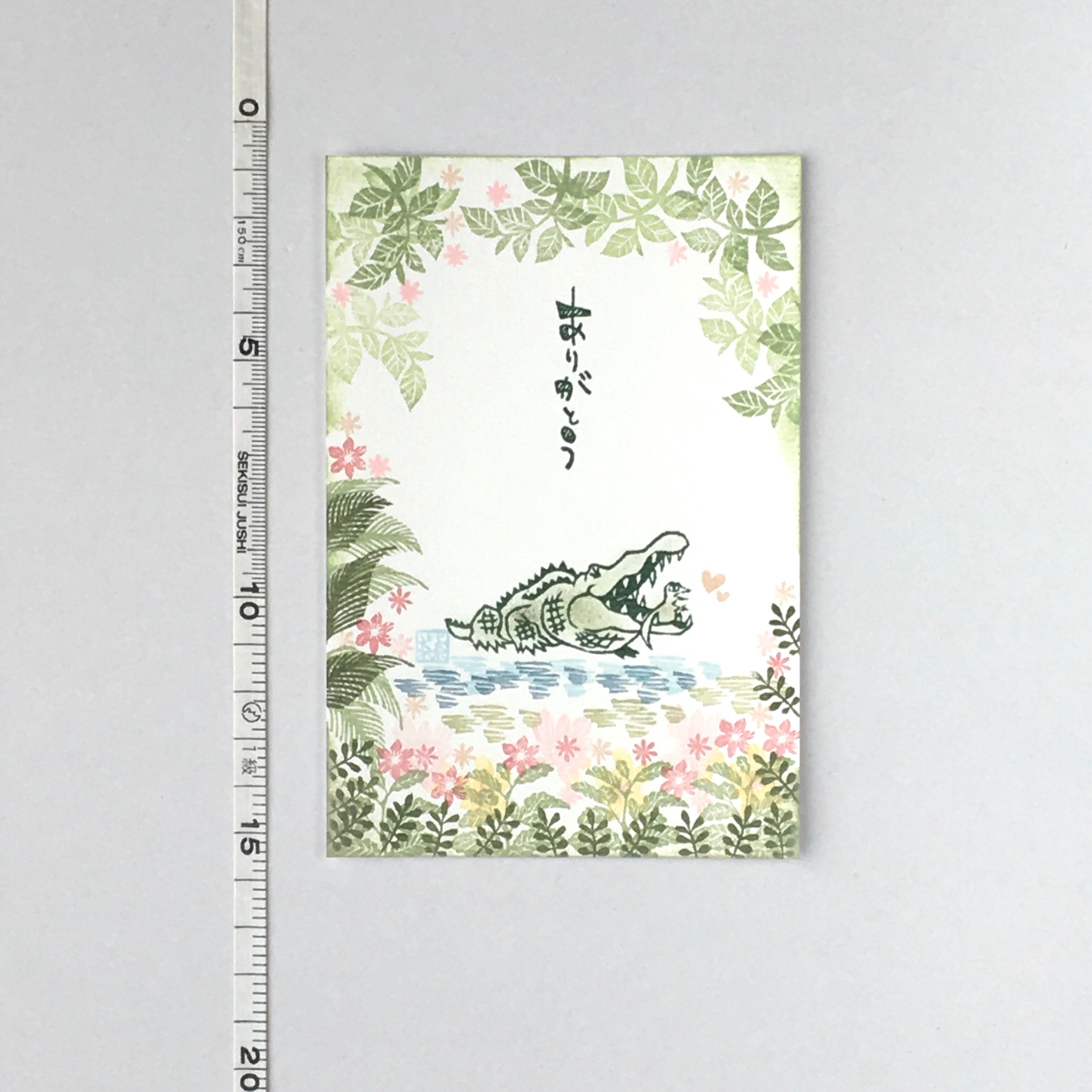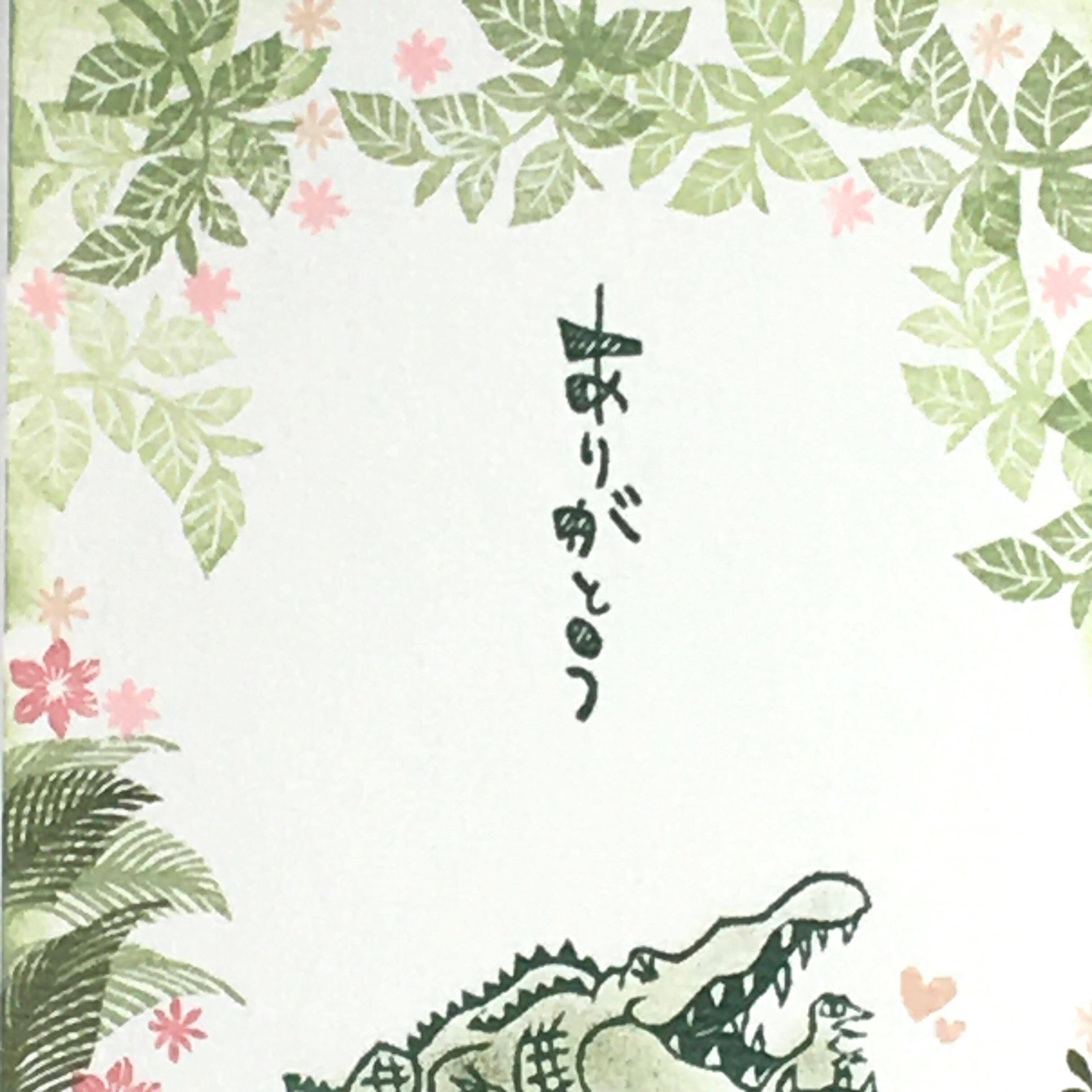 ワニの親子の消しゴムはんこで作った、ありがとうポストカードです。